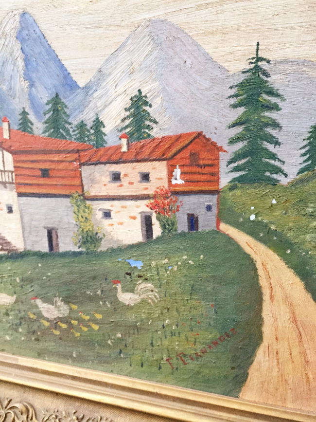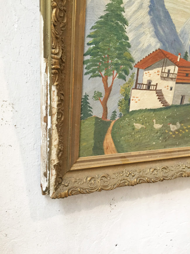 Peinture à l’huile ancienne dans des tons clairs représentant une maison et son paysage de montagne, dans un style assez naïf.