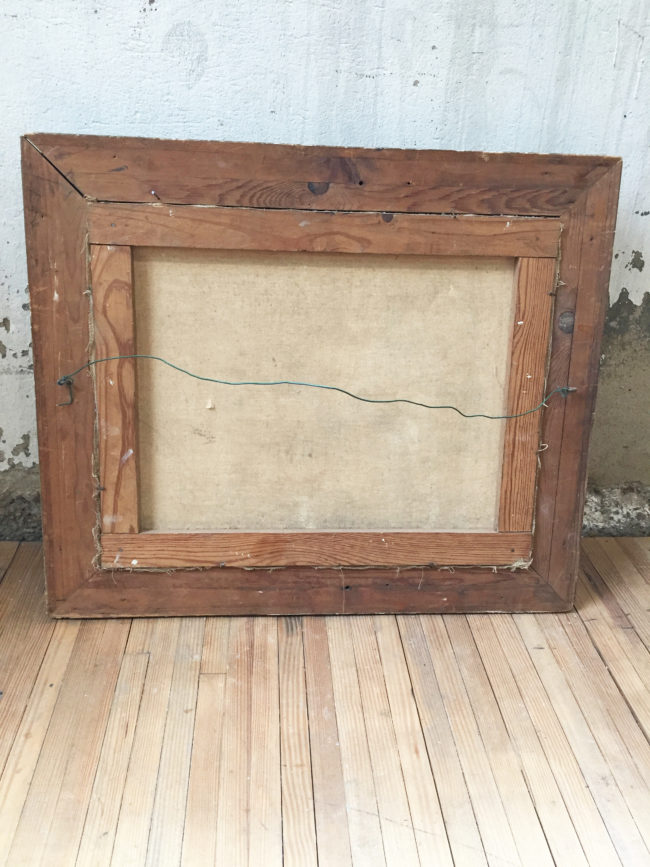 Il y a deux crochets à l’arrière de la toile, montés dans le bois du cadre, qui permettent de venir y fixer une cordelette pour l’accrocher.