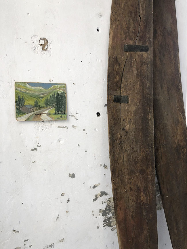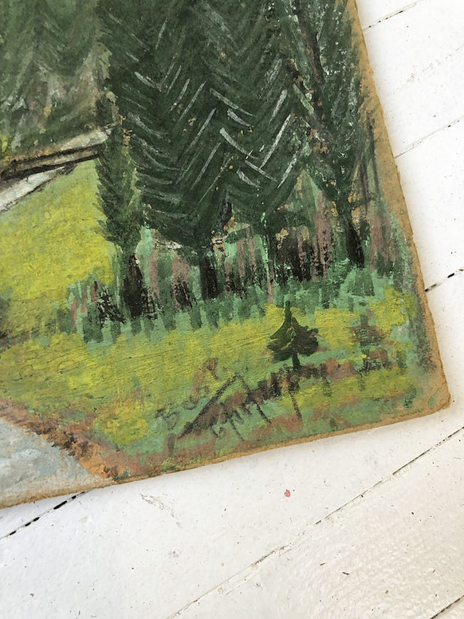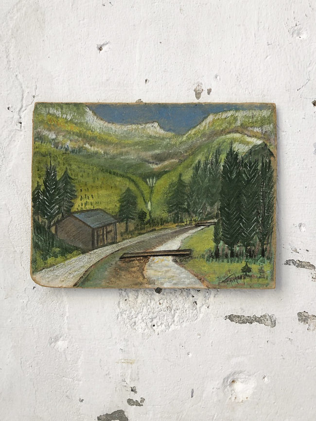 Petite peinture gouache et craie grasse sur bois représentant un paysage de montagne.