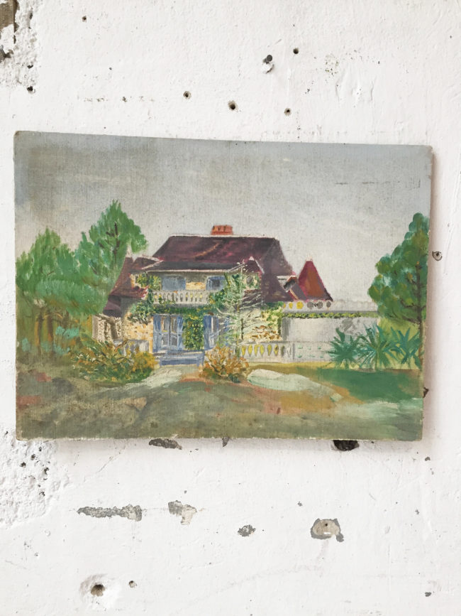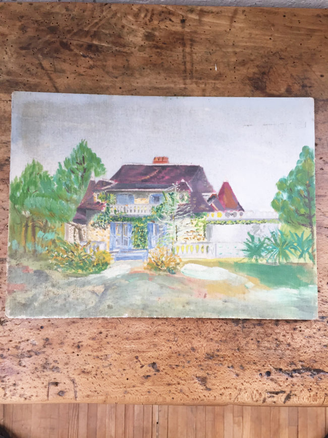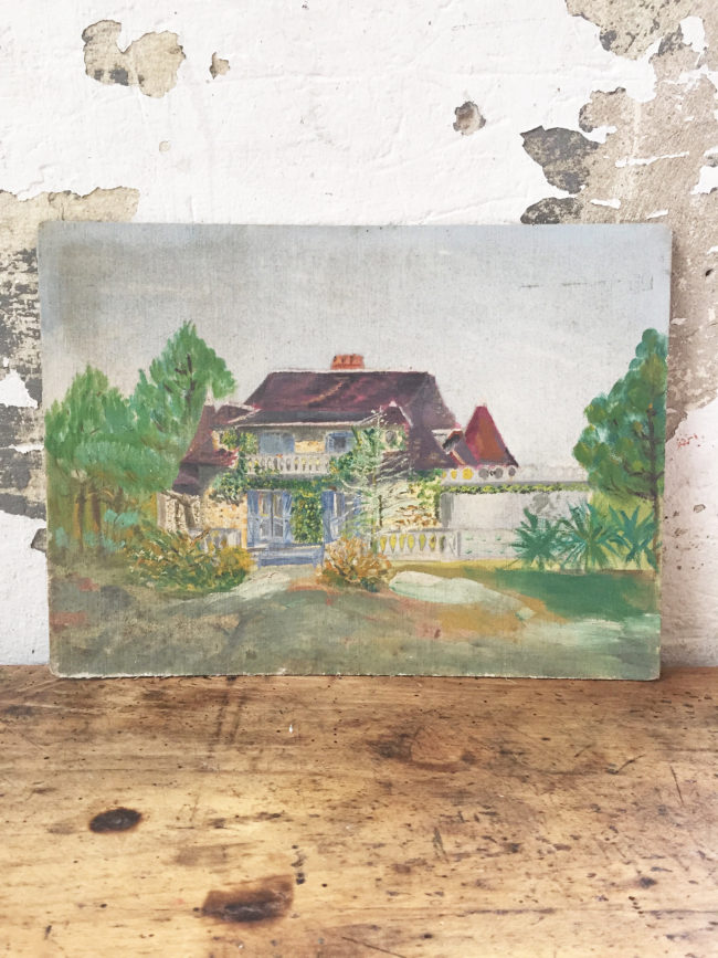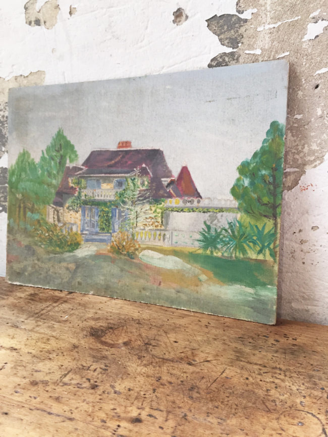 Ancienne petite peinture sur bois représentant une maison vue de l’extérieur.