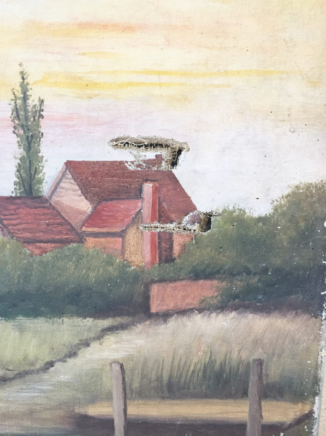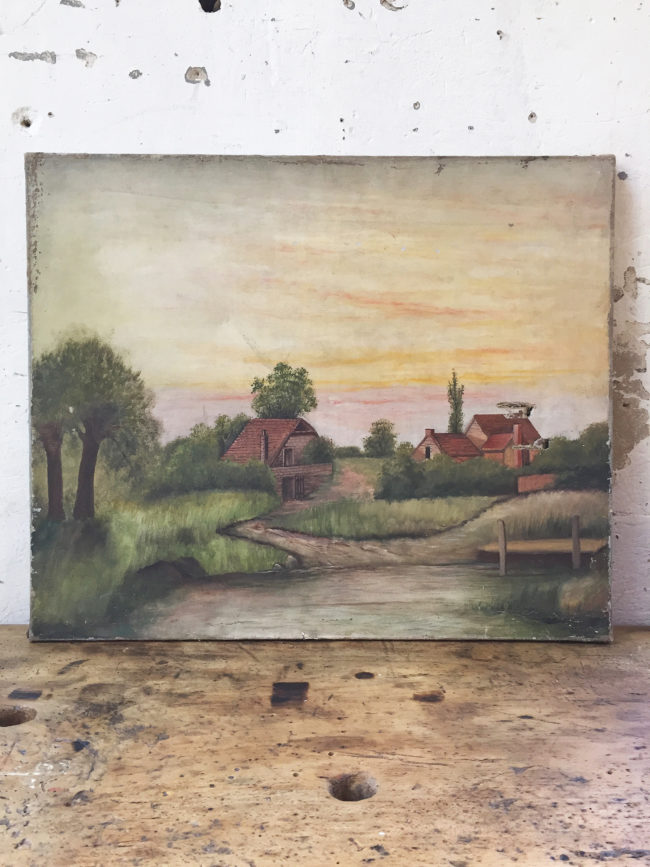 Ancienne peinture à l’huile sur toile représentant un paysage contenant des maisons, et une rivière en premier plan.