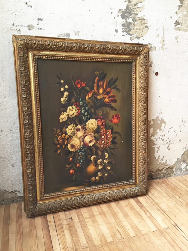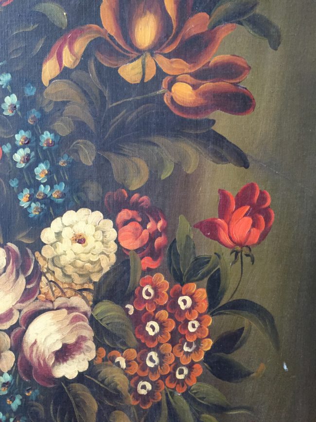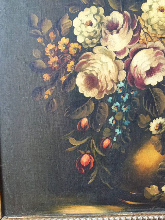 Ancienne toile à l’huile sur support bois encadrée représentant une nature morte aux fleurs.