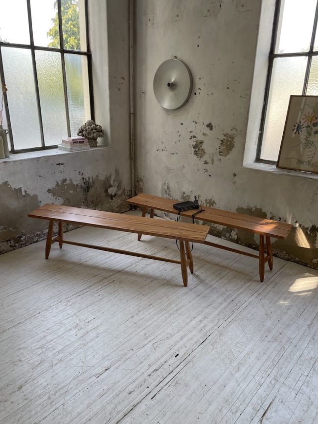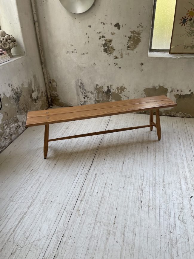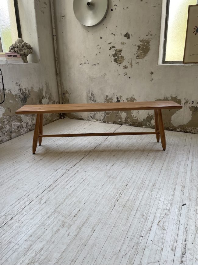 Ce banc fait fortement penser aux influences de Ilmara Tapiovaraa, avec ses pieds fuselées et ses détails d’emboitures. Le banc a totalement été poncé, traité, puis protégé à l’aide d’un vernis chêne clair mat. Ainsi, cela fait joliment ressortir sa patine d’origine.