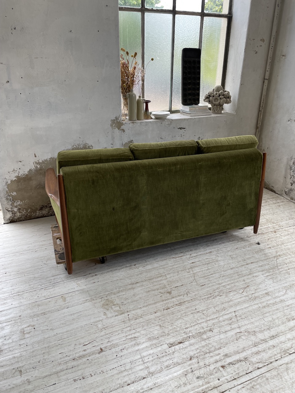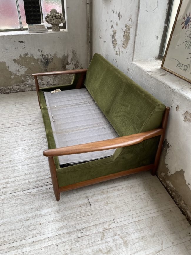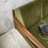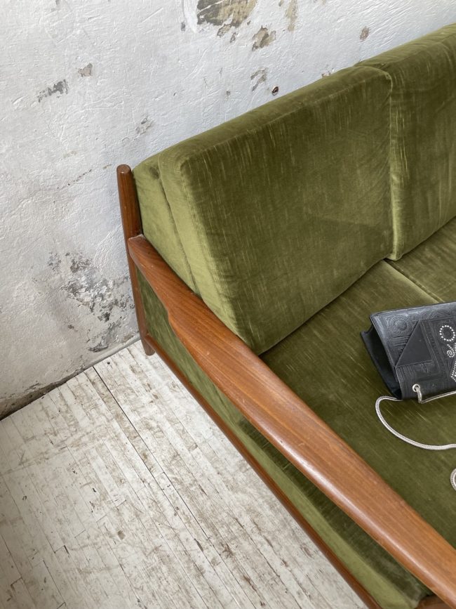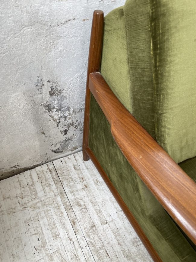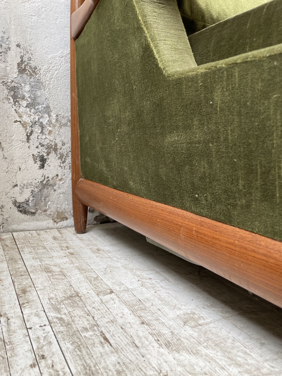 Ancienne banquette scandinave des années 60 avec sa structure teck et ses coussins en velours vert.