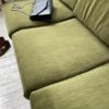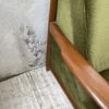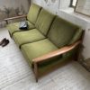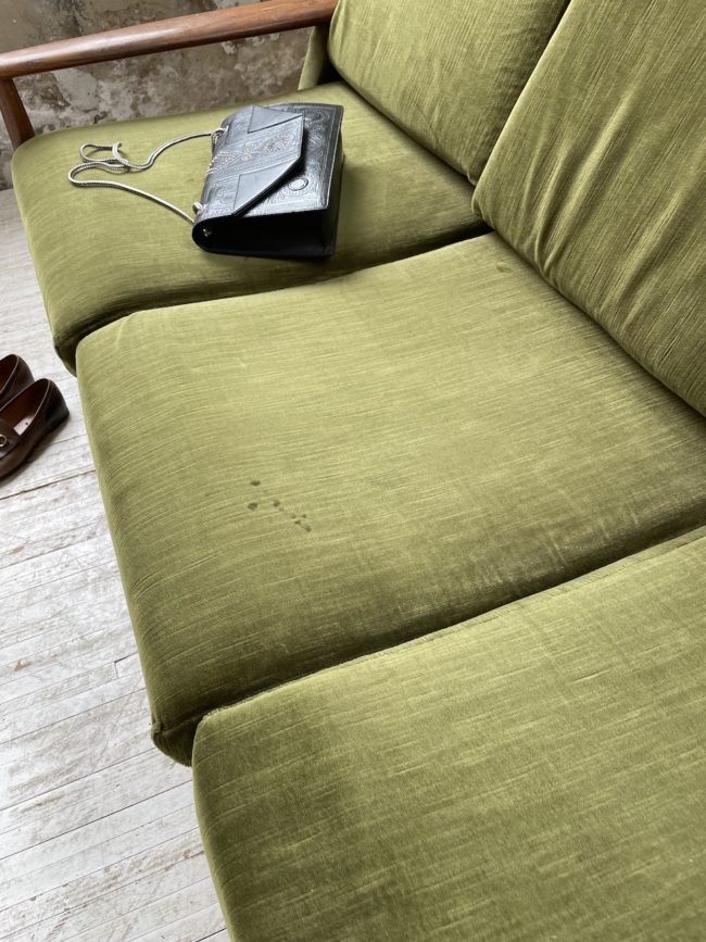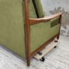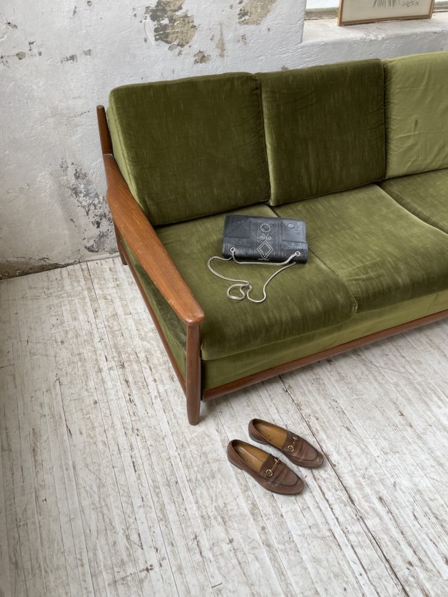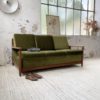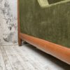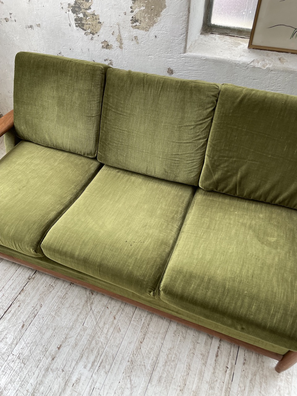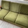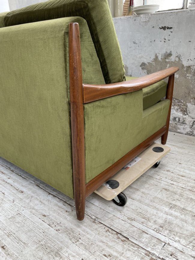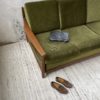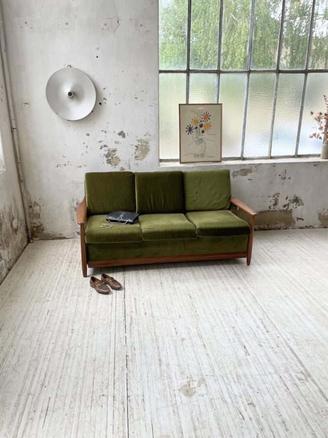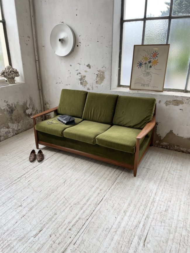 Ancienne banquette scandinave des années 60 avec sa structure teck et ses coussins en velours vert.