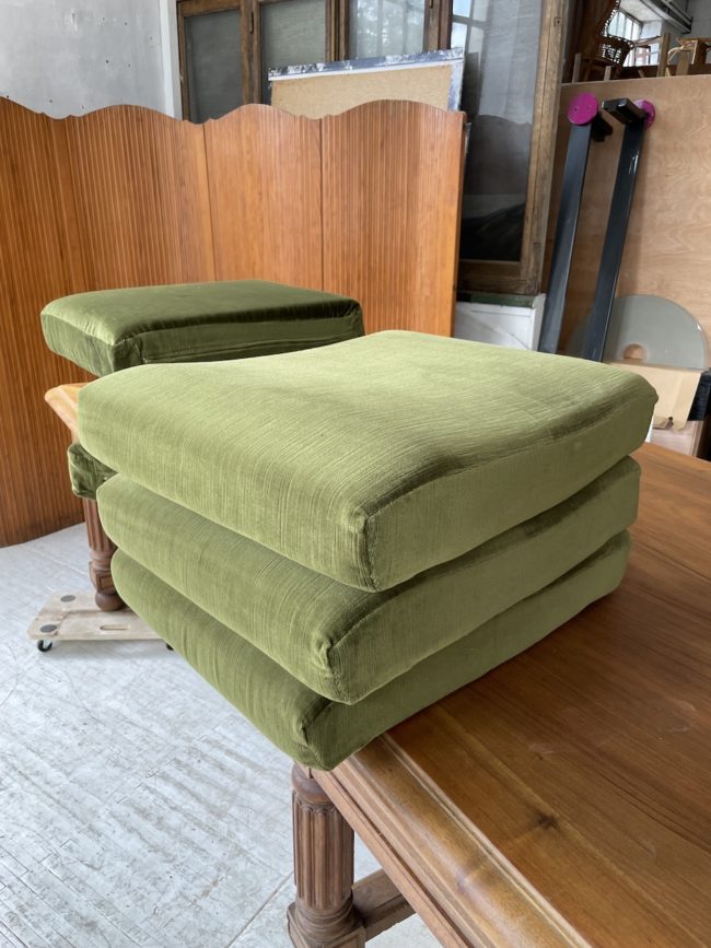 Le tissu est d’origine et peut présenter quelques légers défauts, marques légères et discrètes tons sur tons. Merci de se référer aux photos. Très belle couleur vive et totalement intemporelle. Chaque coussin est déhoussable.