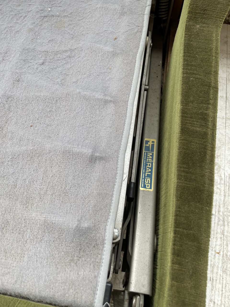 Cette banquette peut se transformer en lit, grâce à un système caché sous l’assise. Un sommier métallique de 140 x 190 cm se déplie et donne accès un matelas léger et un couchage deux places. Il pourrait être idéal de prévoir un surmatelas pour un confort maximal. (Attention ici je n’ai pas pris en photos le système déplié, il s’agit d’un vrai sommier accompagné d’un petit matelas).