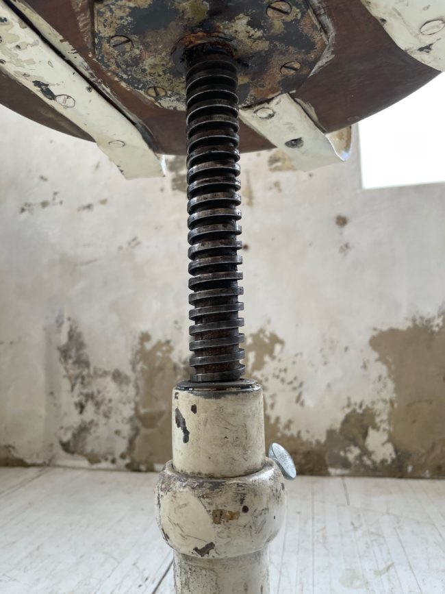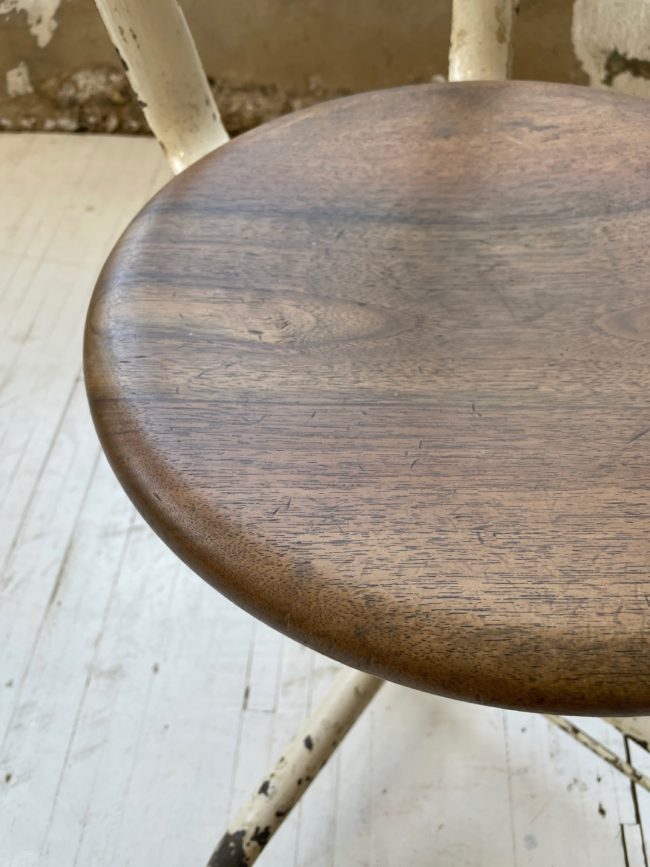 Elle est composée d’une structure en métal patinée blanche, avec une galette en chêne très épaisse de très belle facture.