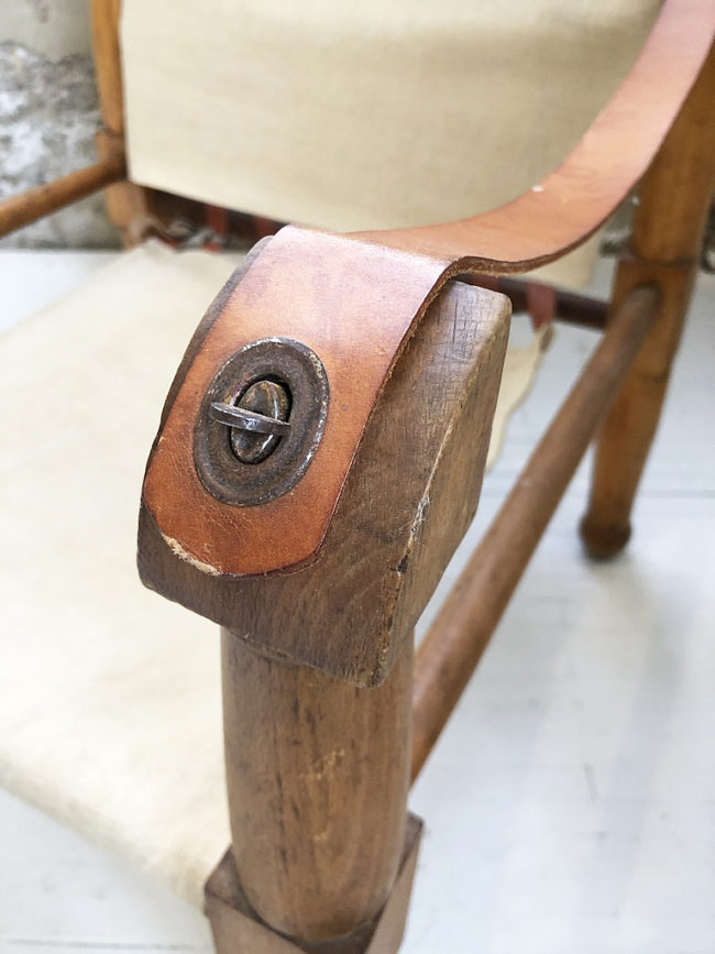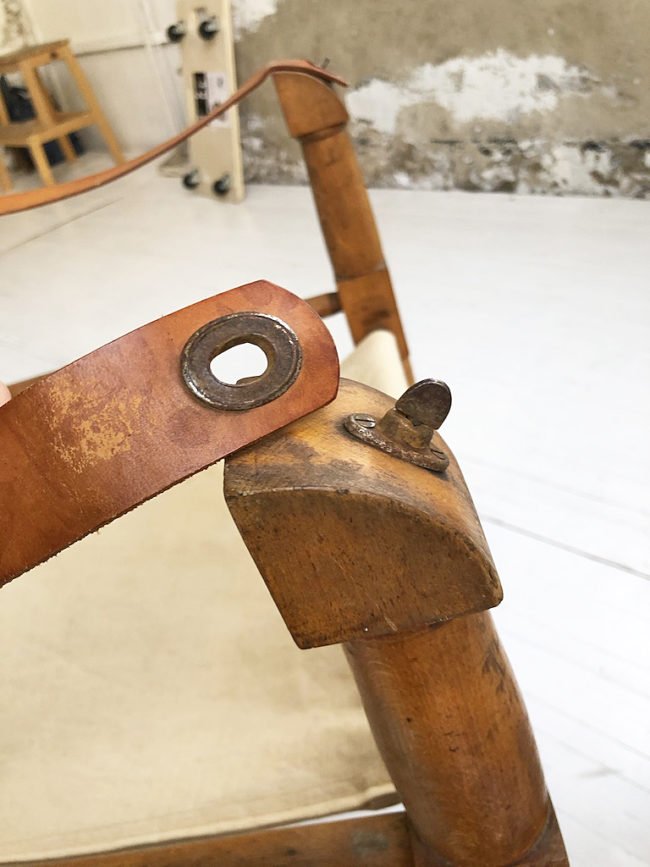 Les lanières en cuir des accoudoirs sont d’origine, elles sont amovibles, à l’aide de taquets métalliques.