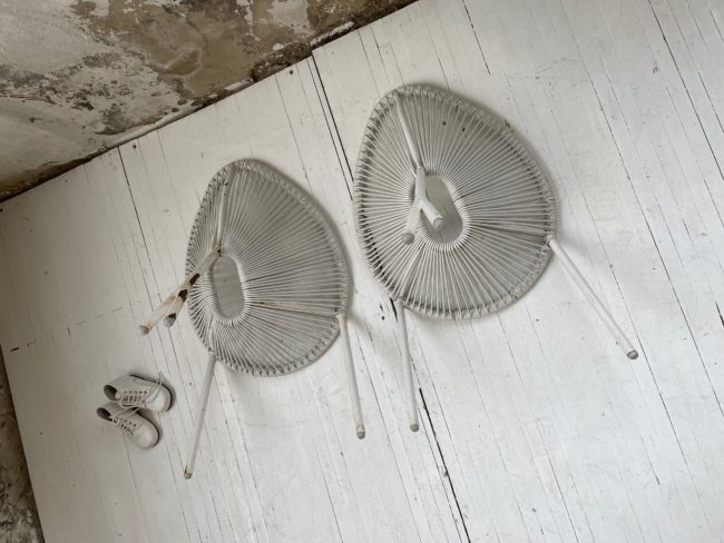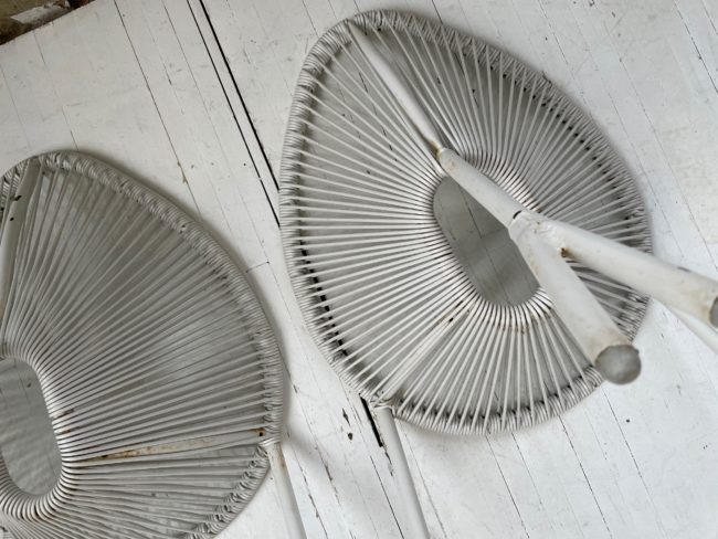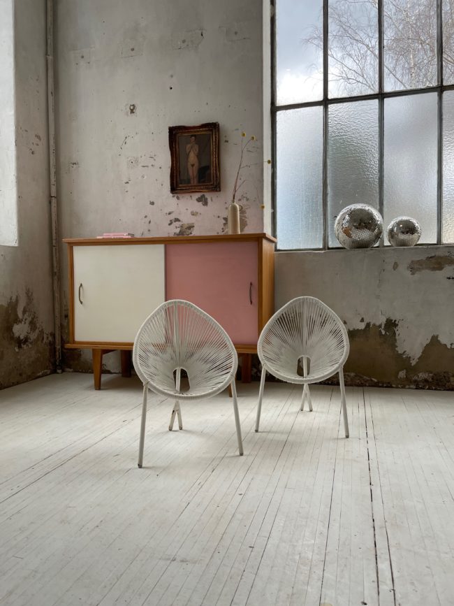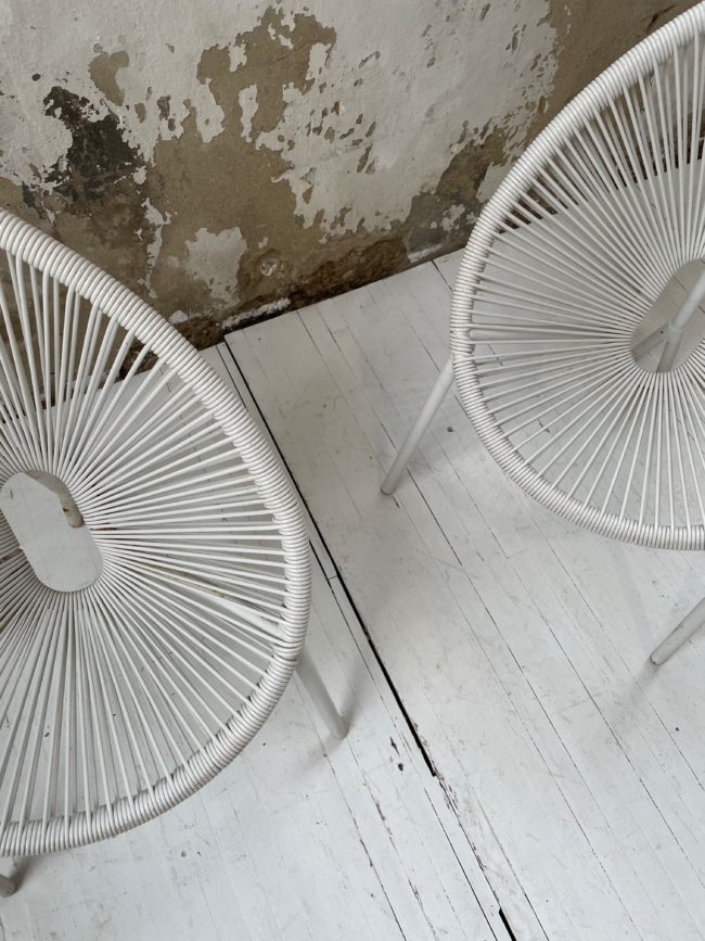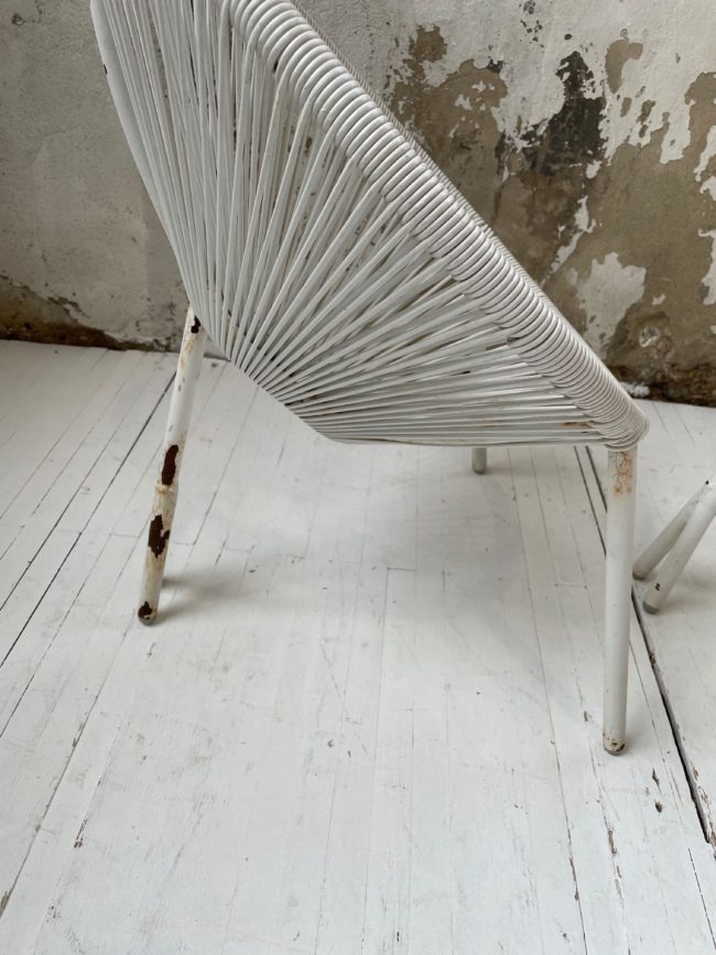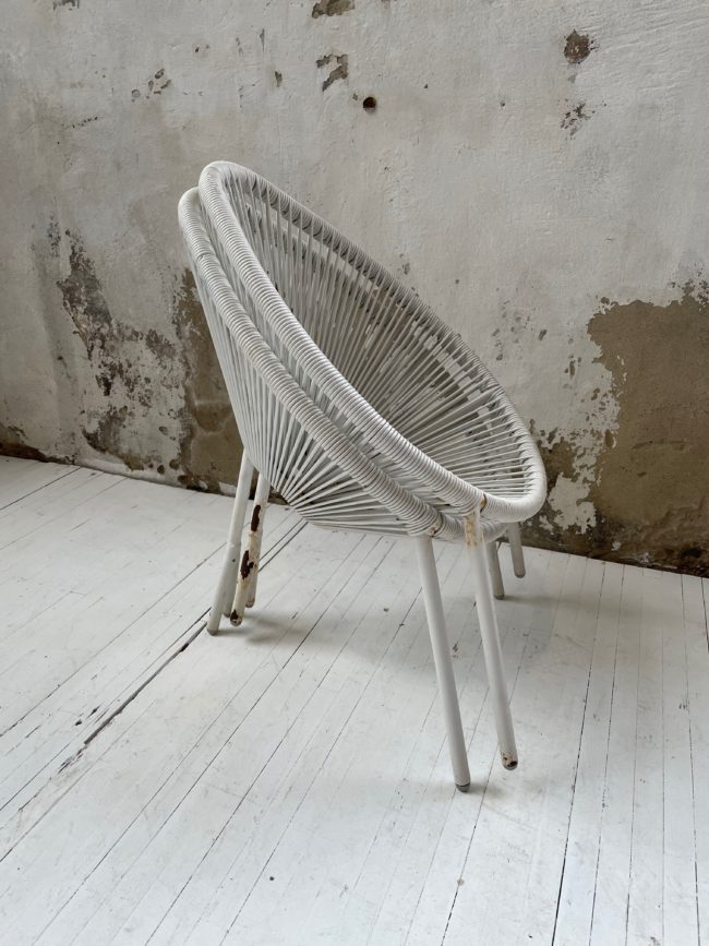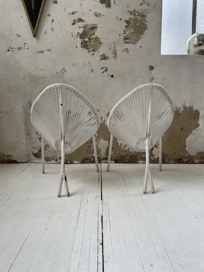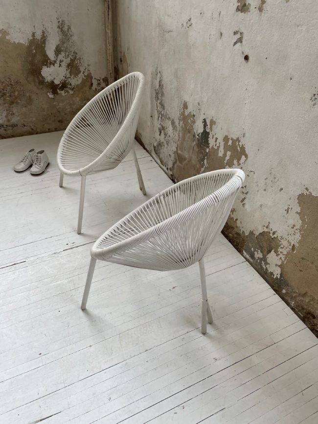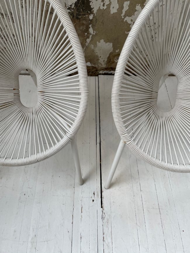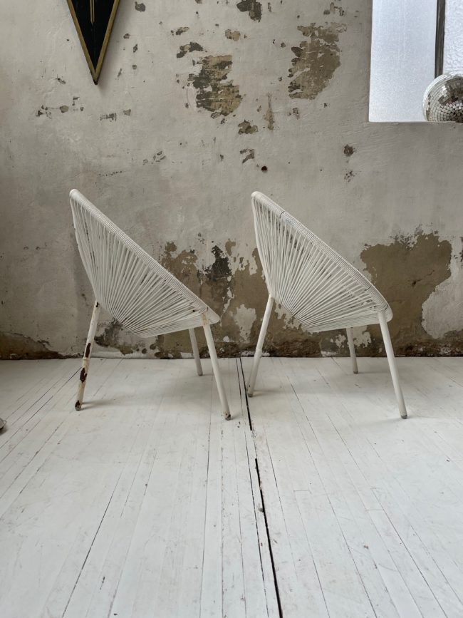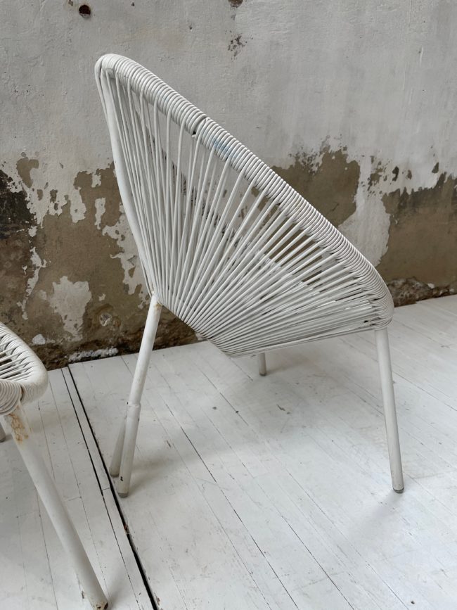 Paire de fauteuils pour enfants en tubulaire blanc et structure recouverte scoubidou blanc.