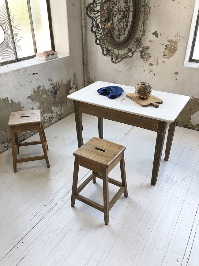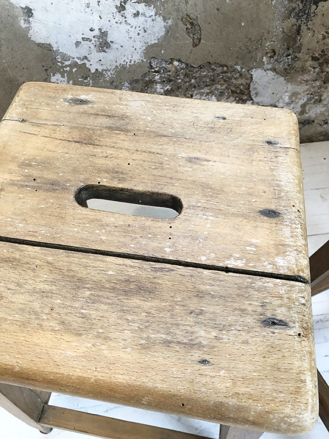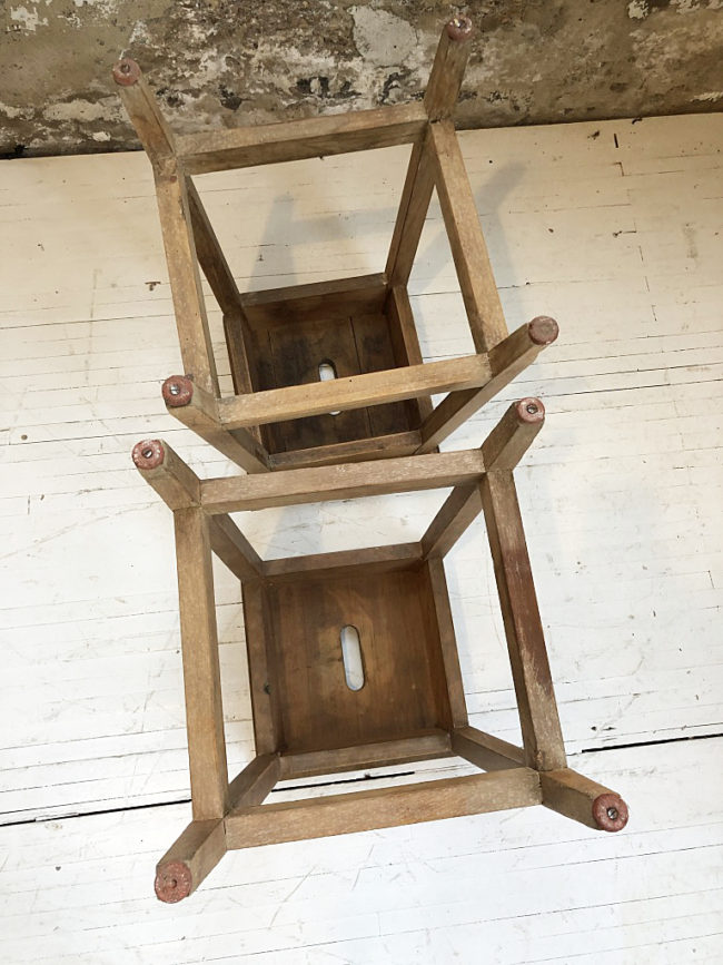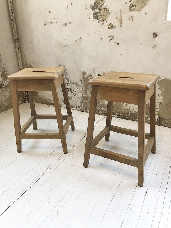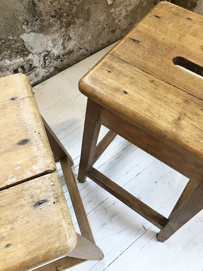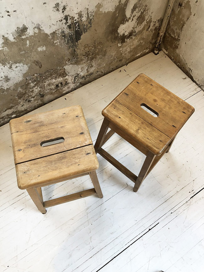 Ancienne paire de tabourets d’atelier en chêne massif.