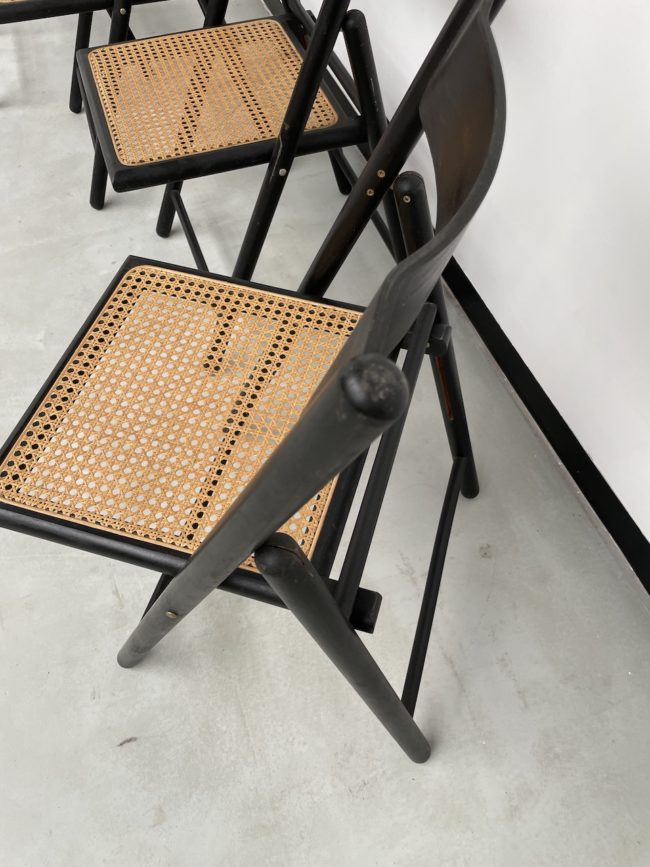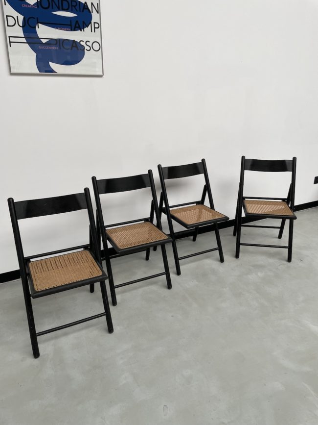 Set composé de 4 chaises pliantes en hêtre noirci et assises cannées des années 60.
