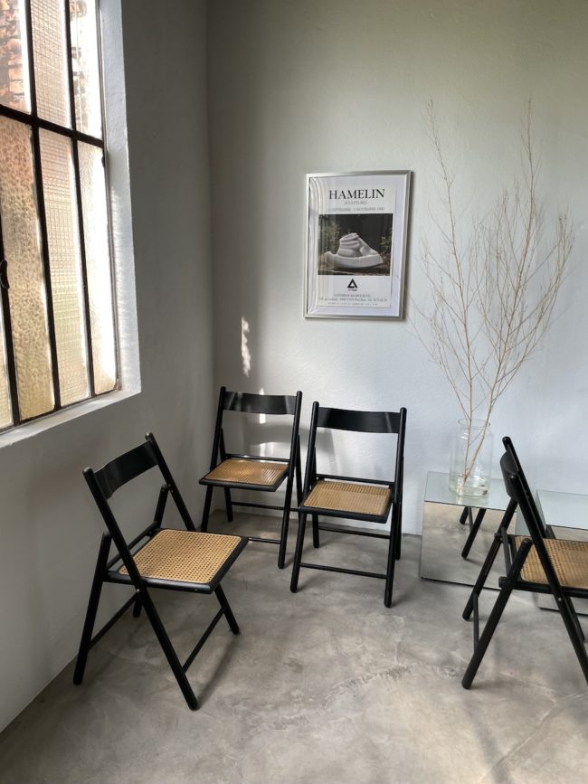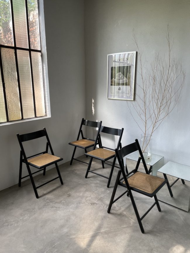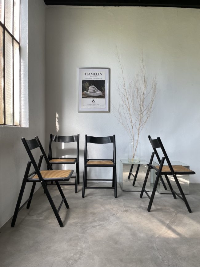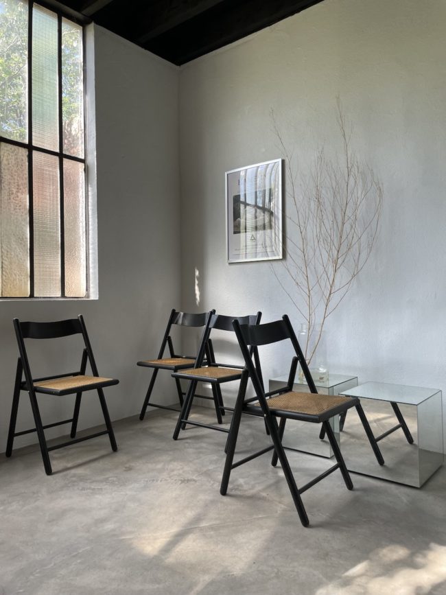 On adore leur design épuré, le contraste encore le bois noir et l’assise en cannage clair. Chaque chaise peut être pliée facilement pour un gain de place certain.