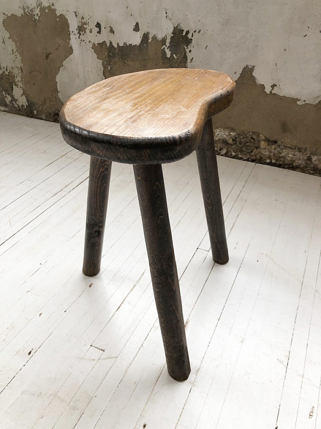 Tabouret artisanal en chêne massif de forme libre type « haricot » reposant sur un piètement tripode.