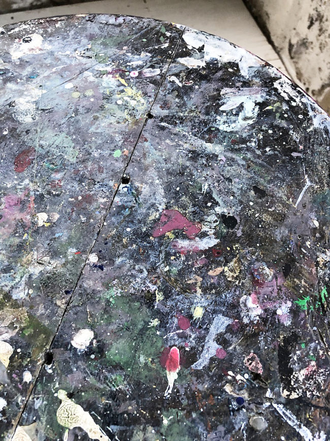 Charme fou pour cette pièce qui possède les traces de son ancienne vie – nombreuses traces de peinture et coulures multicolores.