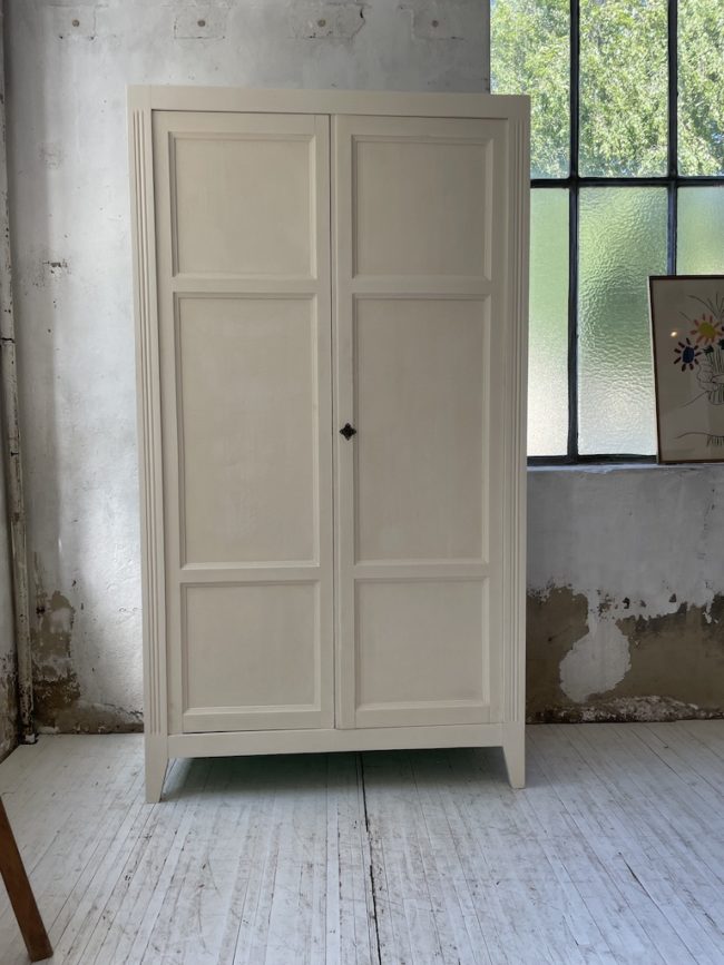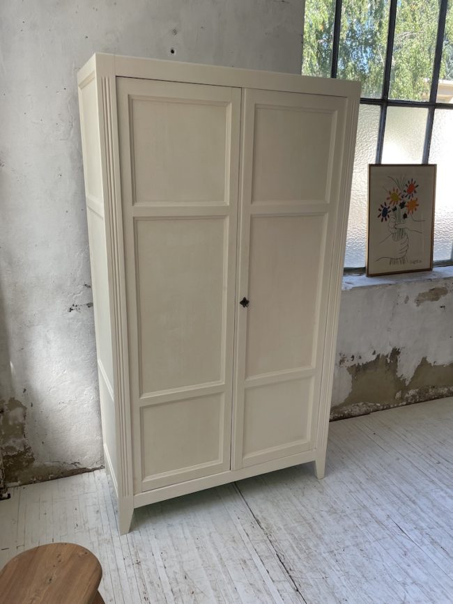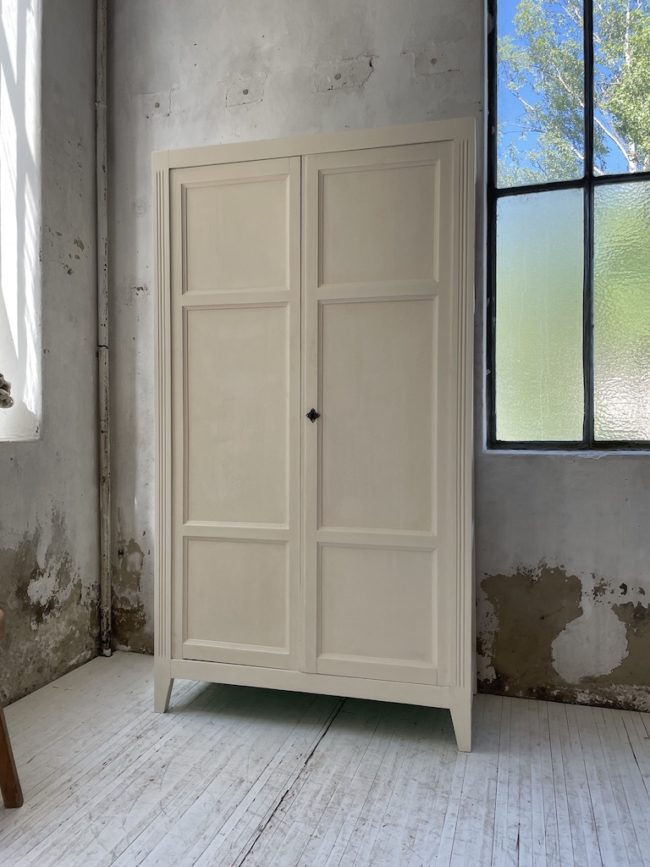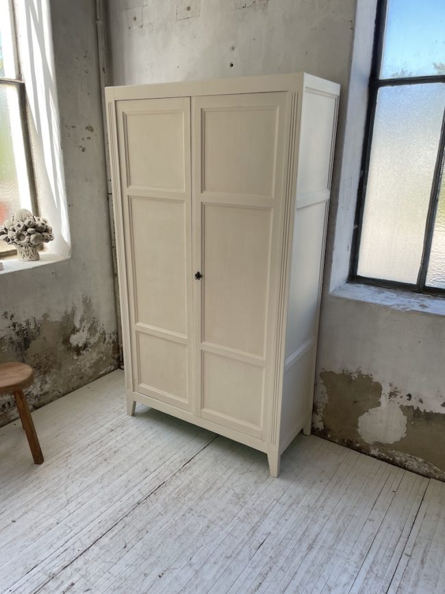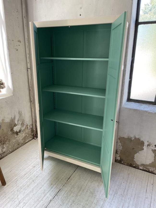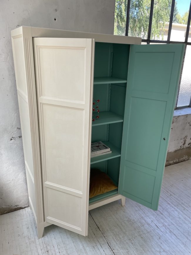 Ancienne armoire bonnetière à deux portes entièrement refaite. Elle a été entièrement restaurée, poncée, traitée, puis peinte avec un blanc ivoire mat, puis cirée pour la protéger. L’intérieur a été peint en vert diabolo, lui apportante touche de pers.