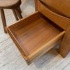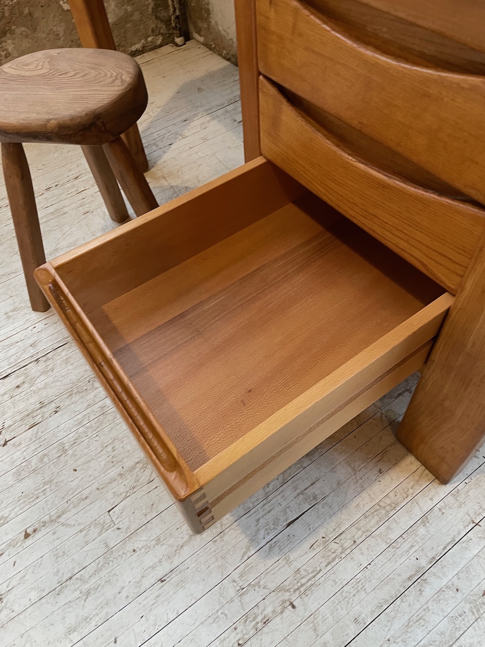 Trois tiroirs permettent un rangement confortable. Très beau veinage et teinte du bois.