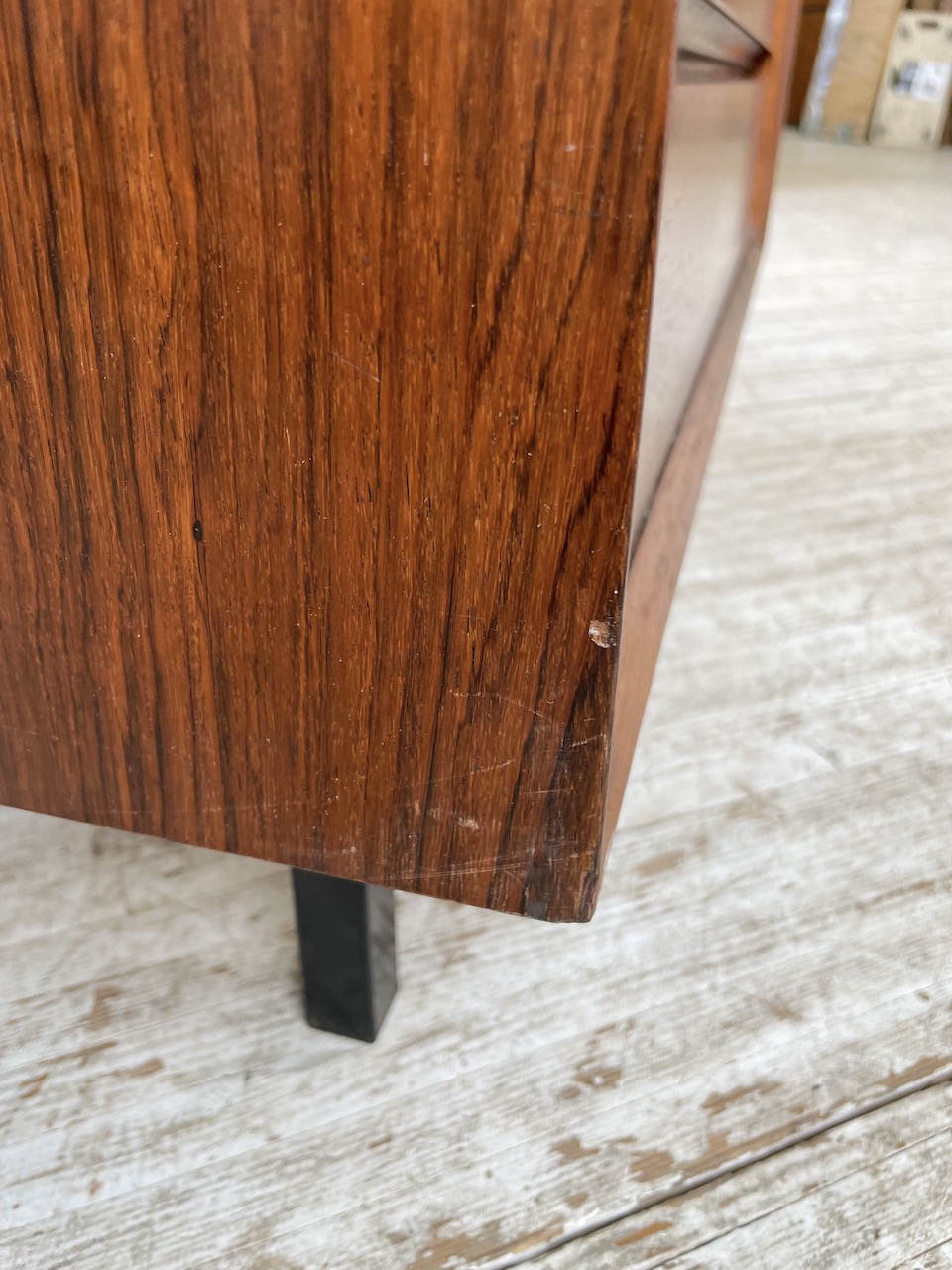 On adore le veinage et la teinte si typiques du bois. Quelques très légers sauts de placage par endroits sur les tiroirs, merci de se référer aux nombreuses photos. Le plateau peut présenter quelques marques dans le bois, faisant référence à sa patine générale.