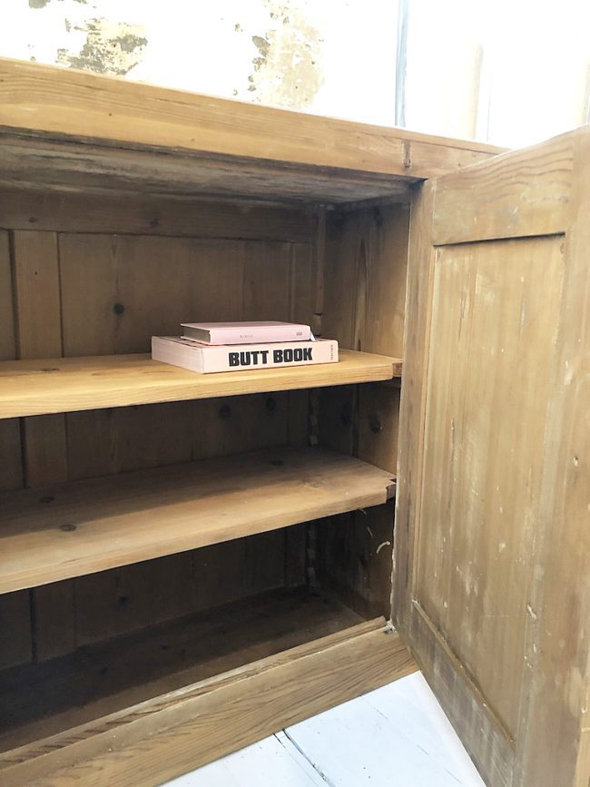 Quelques traces résiduelles de peintures blanches à l’intérieur du meuble sous le vernis.