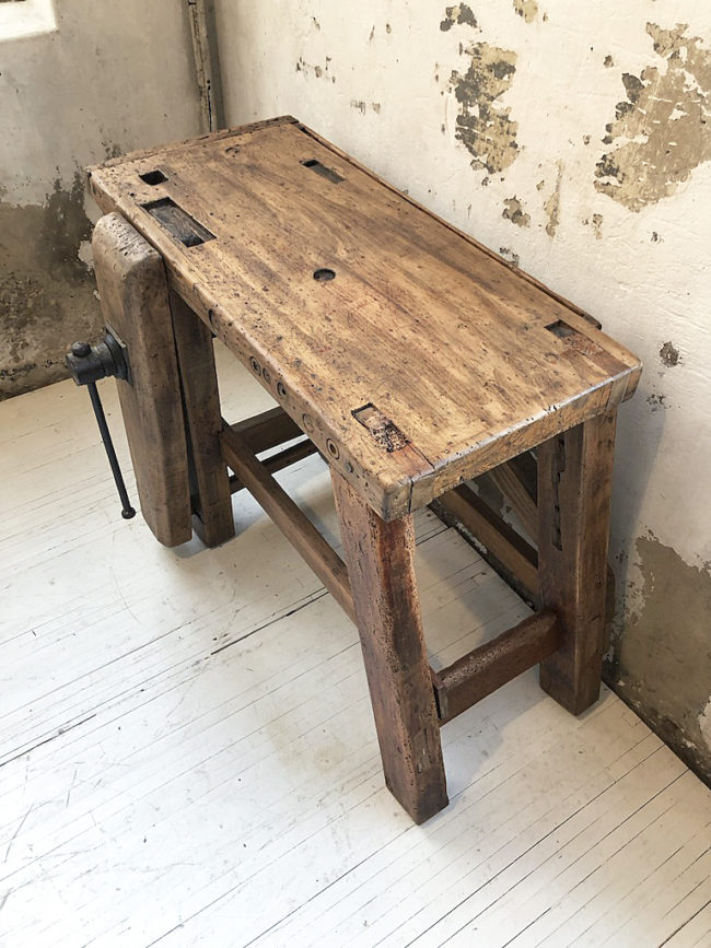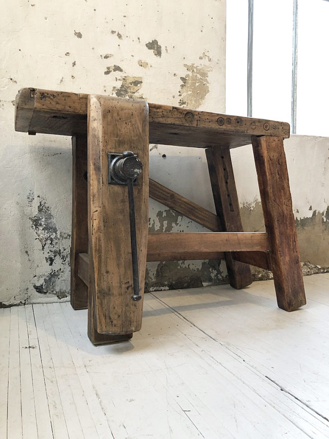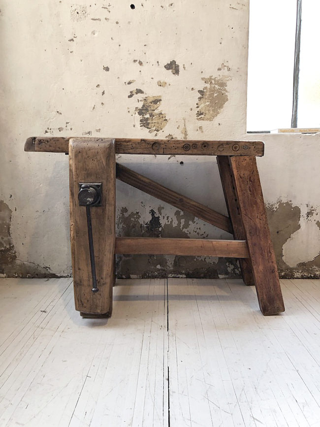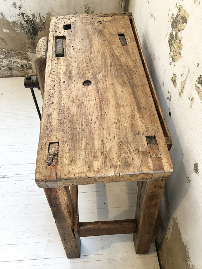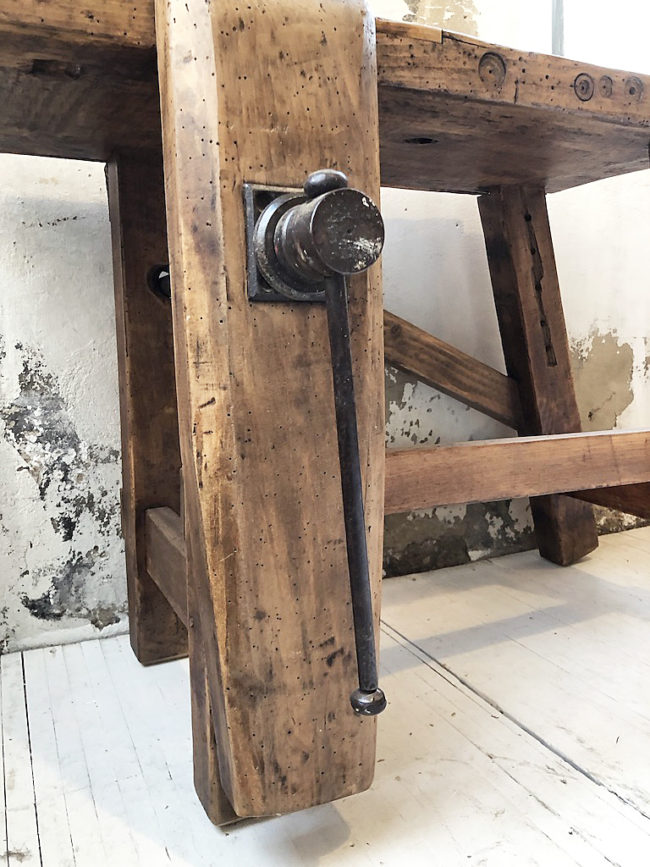 L’établi a entièrement été poncé, traité, légèrement patiné et protégé à l’aide d’un vernis transparent mat.