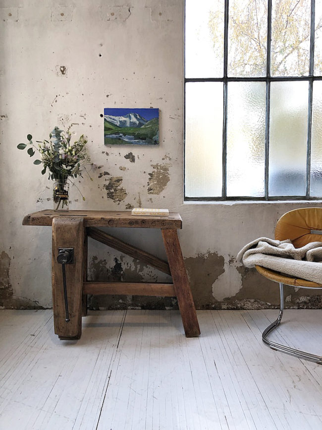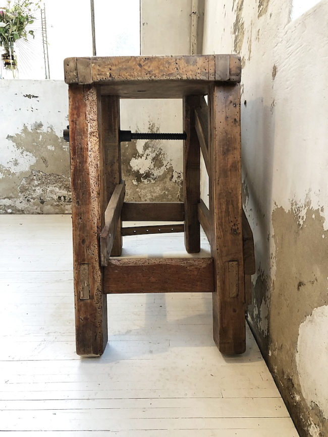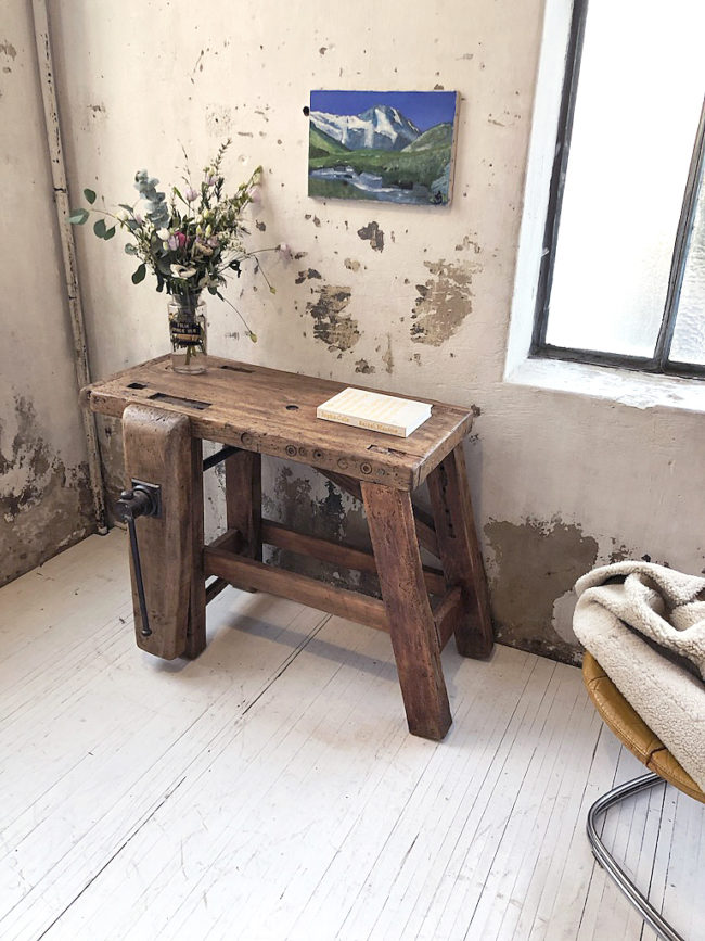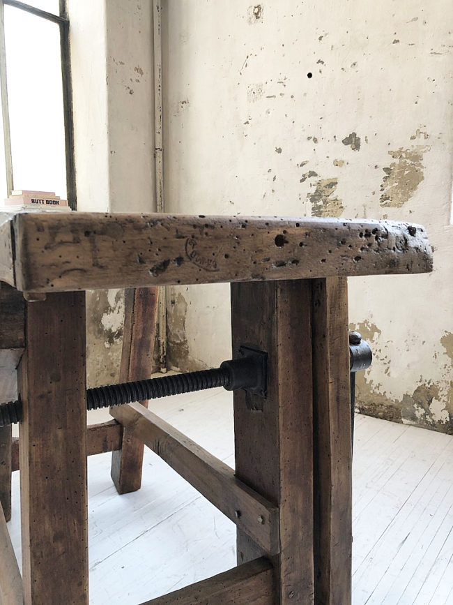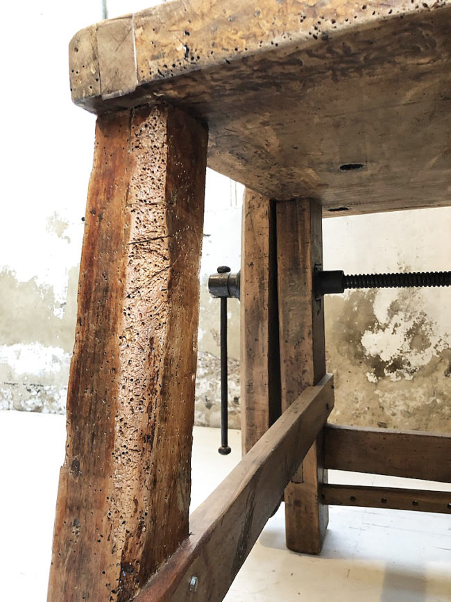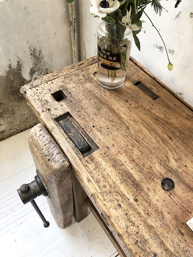 L’établi a entièrement été poncé, traité, légèrement patiné et protégé à l’aide d’un vernis transparent mat.