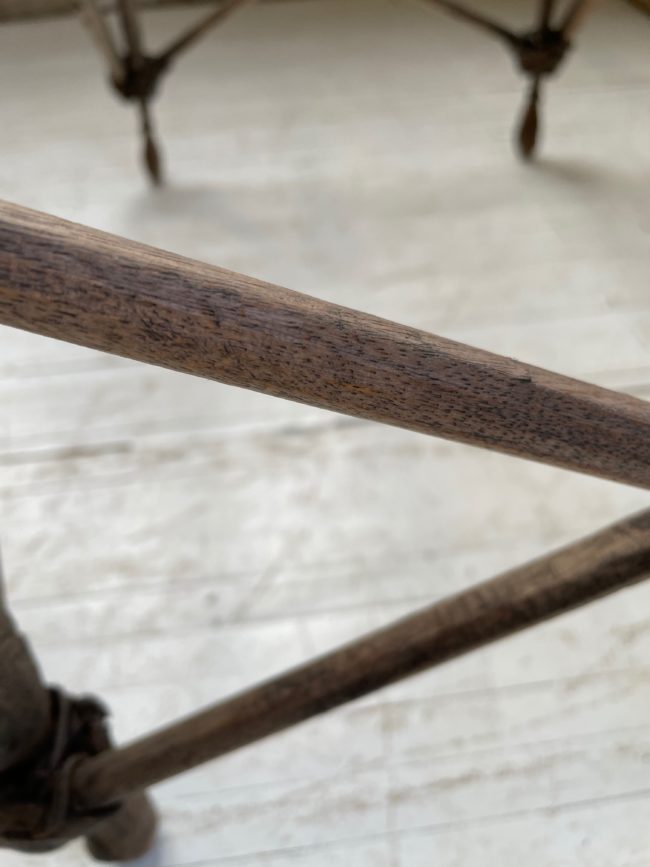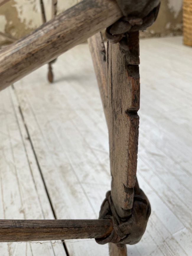 Cet objet entièrement fait main est en bois massif sculpté et taillé main. Du cuir est utilisé comme liens pour la robustesse de l’ensemble.