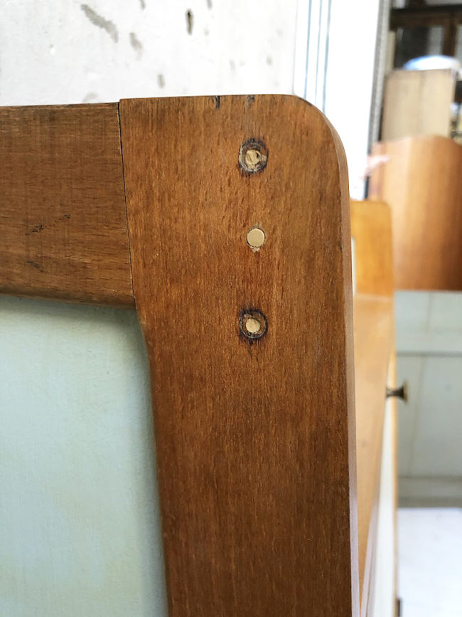 Quelques défauts dans le bois, comme l’attestent les photos. La peinture a été protégée à l’aide d’un vernis mat transparent, qui offre quelques reflets plus foncés sur la peinture.