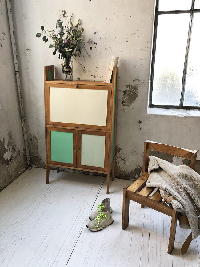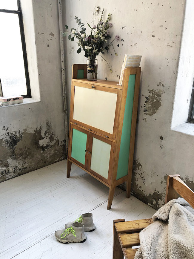 Ce meuble a été restauré, il a en partie été poncé, puis peint dans des nuances pastels claires de tonalités tricolores. Les parties en bois brut, quant à elles, ont été conservées dans leur patine afin de garder le charme du meuble. Les boutons de poignées ont été remplacés par de jolis boutons laitonnés massifs. Une fois la tablette abaissée, le secrétaire est idéal en bureau, avec une chaise au format standard.