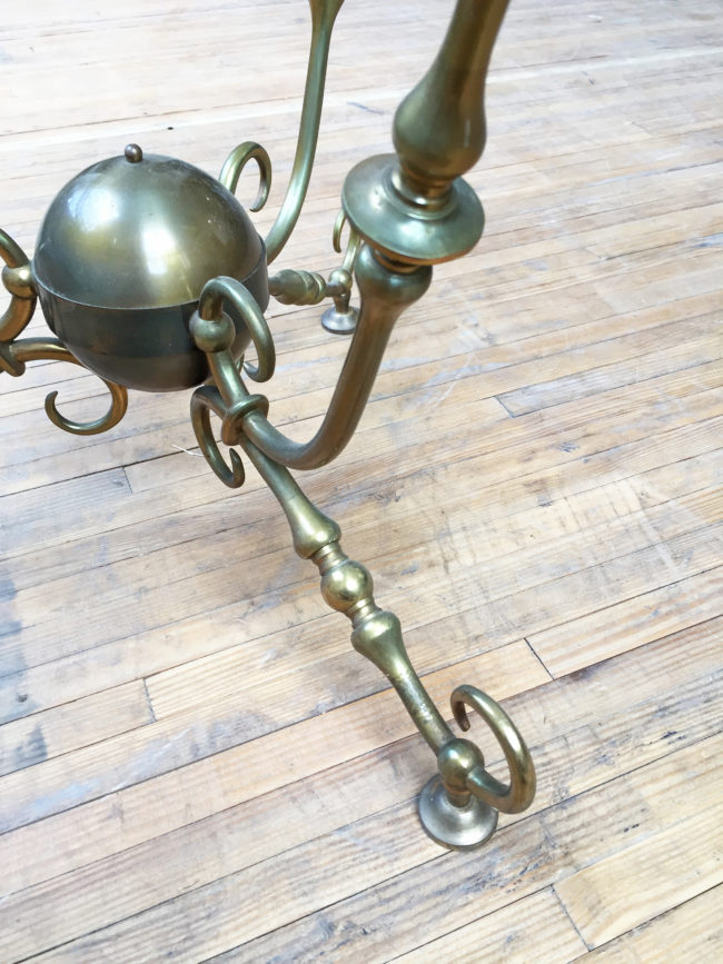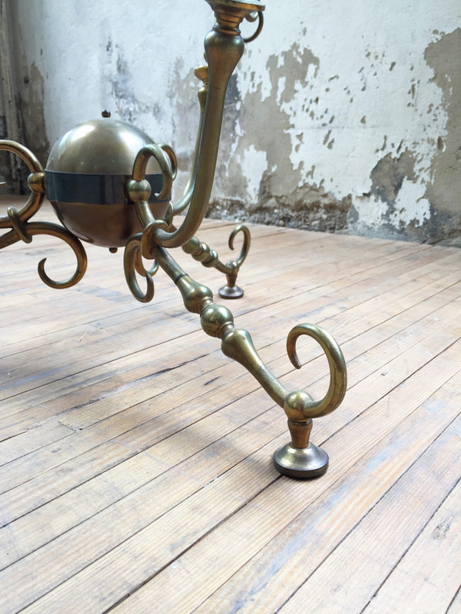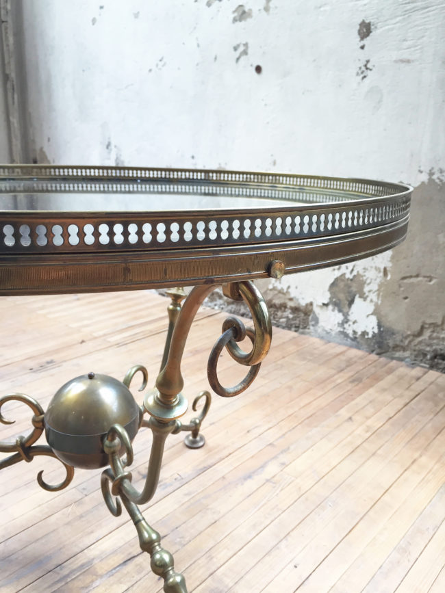 Elle possède un style très distingué et très affirmé. Reposant sur un piètement tripode mouvementé à enroulements réunis par une entretoise sphérique, elle possède de nombreux détails tels des anneaux tombants au sommet du piétement ou encore une galerie en laiton ajouré.