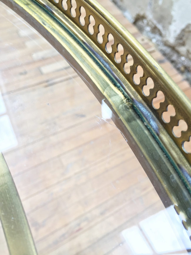 Le plateau est en verre et présente deux éclats mineurs contre la galerie en laiton, qui ne sont pas gênants, et à peine visibles.