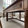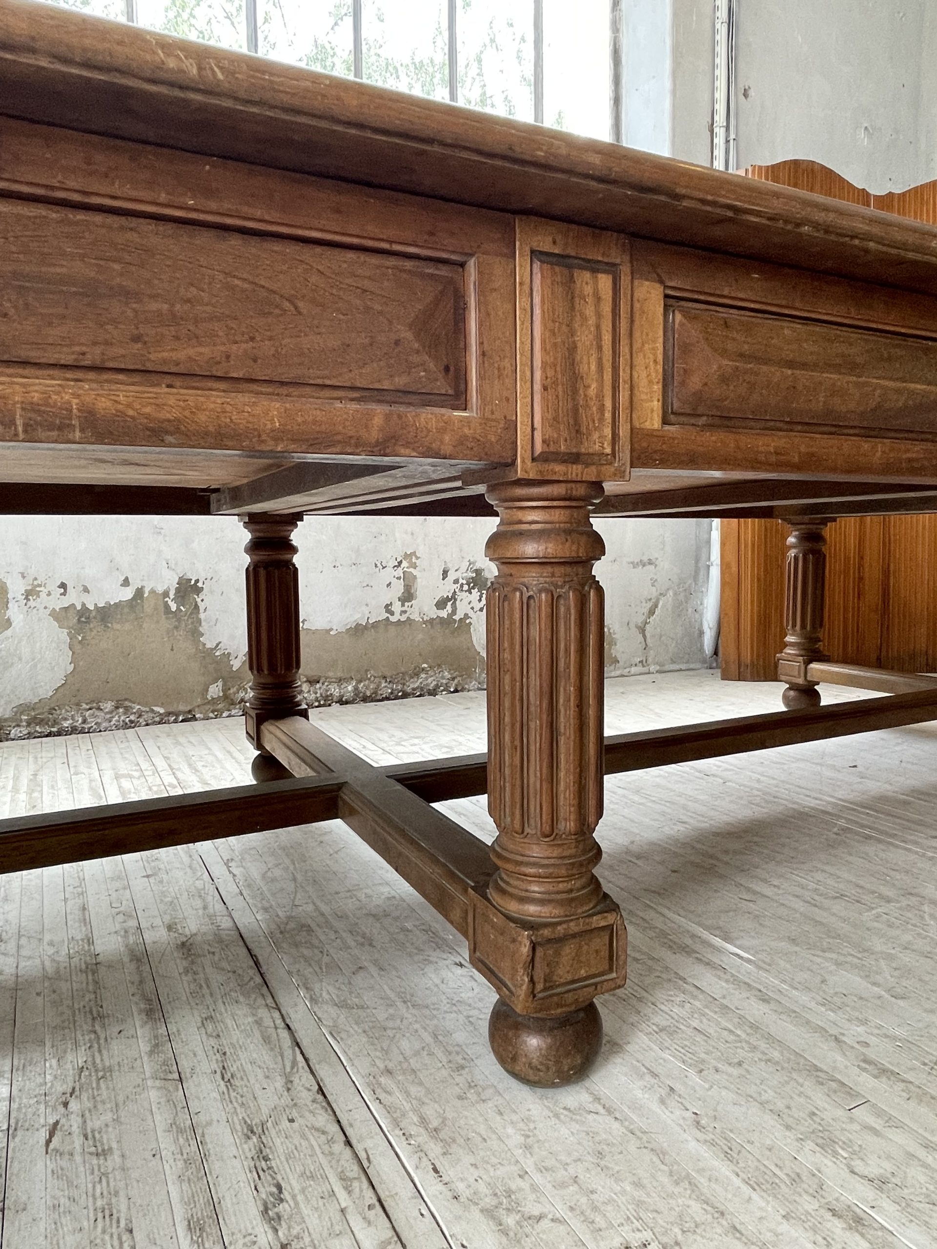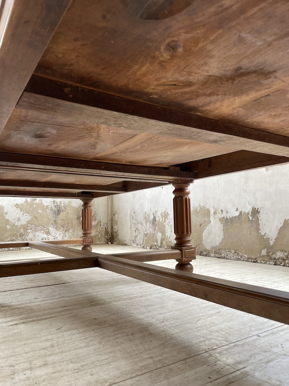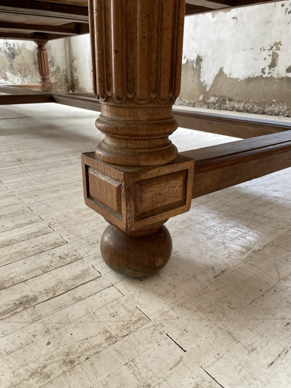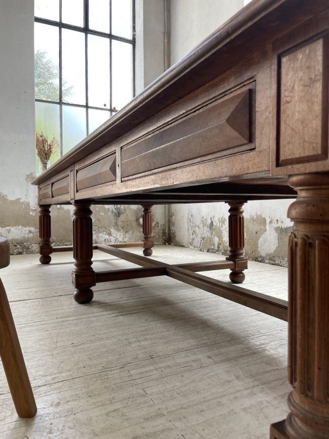 Les pieds très épais possèdent des cannelures magnifiques,. Travail incroyable dans le bois, et tous les détails qui composent cette table, pieds boules surmontés de carrées panneautés, pieds tournés, encoignures rappelant le bas du piètement. Quatre tiroirs qui disparaissent dans la structure de la table, possèdent le même motif en diamant que l’autre façade.