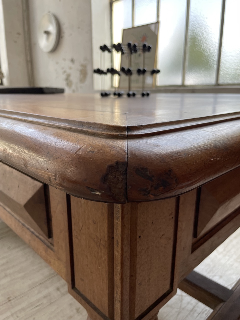 Attention cette table est très ancienne, et possède forcément quelques défauts dans le bois. On peut noter que le bois est légèrement piqué par endroits, inhérent à son grand âge.